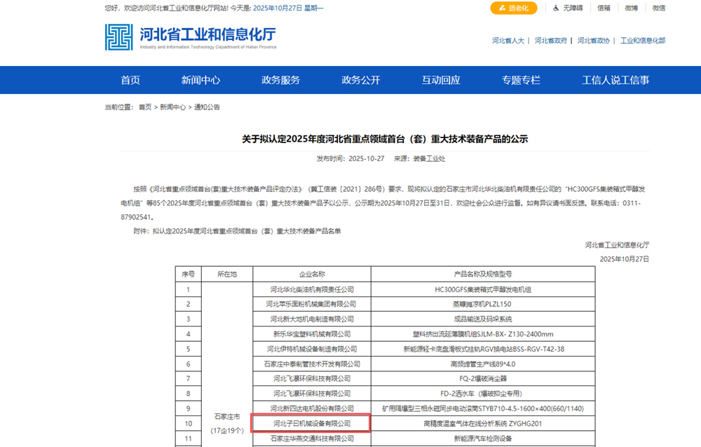 10月27日,河北省工业和信息化厅公示 2025 年度河北省重点领域首台(套)重大技术装备产品名单,我公司自主研发的 “高精度温室气体在线分析系统ZYGHG201”成功入选,彰显企业硬核技术实力。
